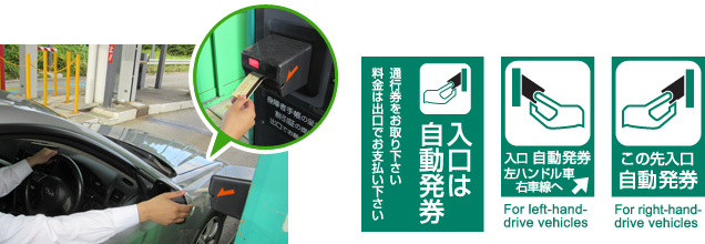 ② At the Entrance tollgate, collect your toll pass ticket from the automatic ticket machine. The ticket will show the vehicle classification, name of the entrance interchange, date and time of issuance, and other information. (*Some entrance tollgates allow cash prepayment.)