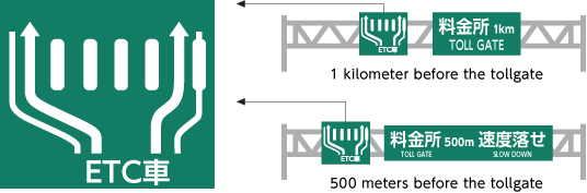 Direction signs indicating the position of ETC lanes are installed at the approach to the Exit tollgates. As you approach the tollgate, refer to the sign and proceed to an ETC lane.